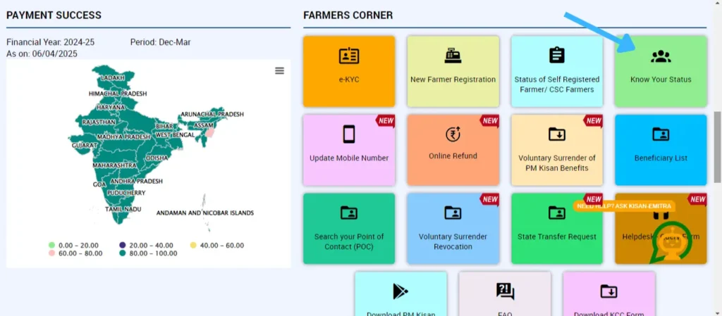 Farmers Corner में जाएं, Know Your Status विकल्प पर क्लिक करें,