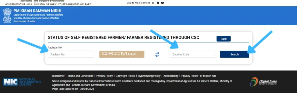 - Status of Self-Registered Farmer / Farmer Registered Through CSC विकल्प चुनें और आधार नंबर दर्ज करके स्टेटस देखें।
