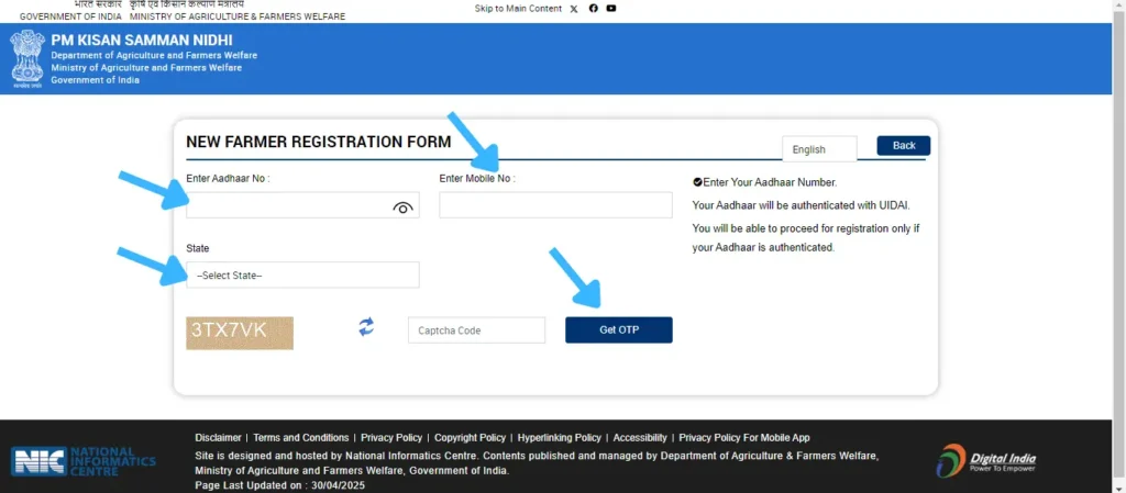 अपना आधार नंबर, व्यक्तिगत जानकारी, भूमि विवरण और बैंक डिटेल्स भरें। फॉर्म भरने के बाद Submit करके रजिस्ट्रेशन पूरा करें।